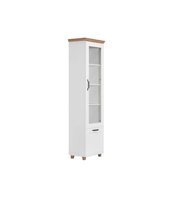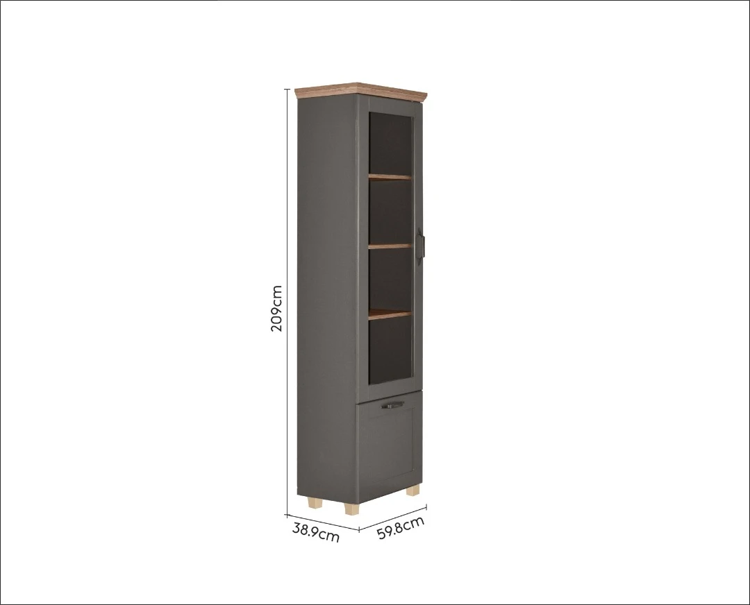 Staklena vitrina Contempo predstavlja praktičan, elegantan i višenamenski komad nameštaja koji se lako uklapa u svaku prostoriju. Njena funkcionalnost i moderan dizajn pružaju dovoljno prostora za odlaganje knjiga, ukrasa i drugih dekorativnih predmeta. Stakleni panel na vratima doprinosi estetici i otvara prostor. Osim toga, vitrina zauzima vrlo malo prostora, što doprinosi maksimalnoj iskorišćenosti ambijenta.KarakteristikeKonstrukcija vitrine napravljene od univera debljine 18mm, obezbediće maksimalnu stabilnost i izdržljivost elementaVrata izrađena od medijapan 19mm, presvučena PVC folijom koja pruža dodatnu zaštitu od vlage i izuzetnu otpornost na habanje i udarce, a pritom se i lako čistiUsporivači na komodi omogućavaju tiho i lagano zatvaranje vrata, čime se sprečava oštećenje vrata i šarki, pored toga doprinosi dužem veku trajanja elementaRučice od metala su vrlo izdržljive i otporne na habanje i pucanje