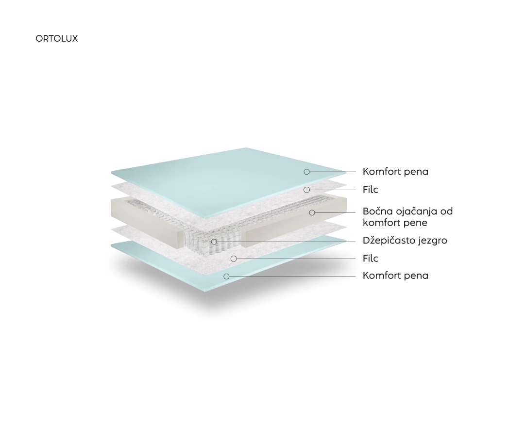 Dušek ORTOLUX je izrađen na osnovi bloka opruga džepičastog jezgra obloženog sa više slojeva SkyCell pene. Specijalno konsturisana džepičasta jezgra pružaju telu optimalnu i ravnomernu potporu tokom sna. Dodatni vizuelni i estetski efekat postignut je posebnim sistemom štepanja bočnih stranica dušeka (“grčka kocka”).