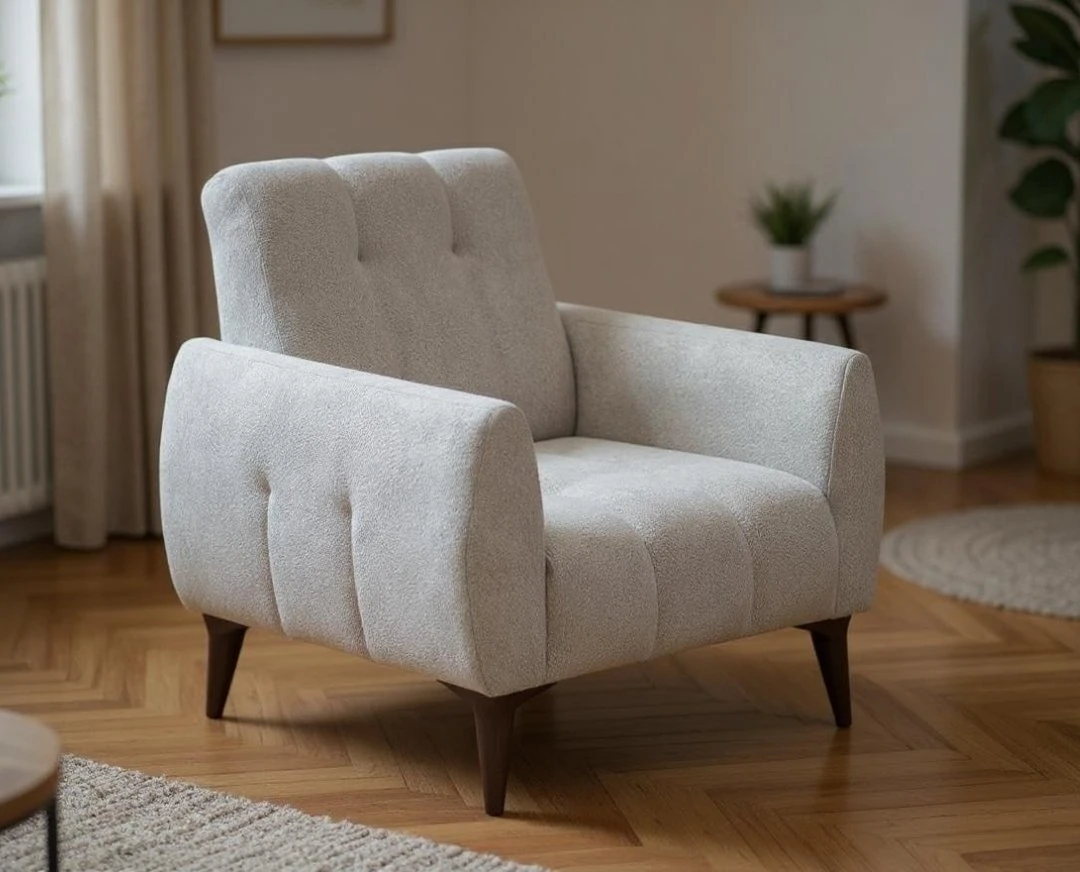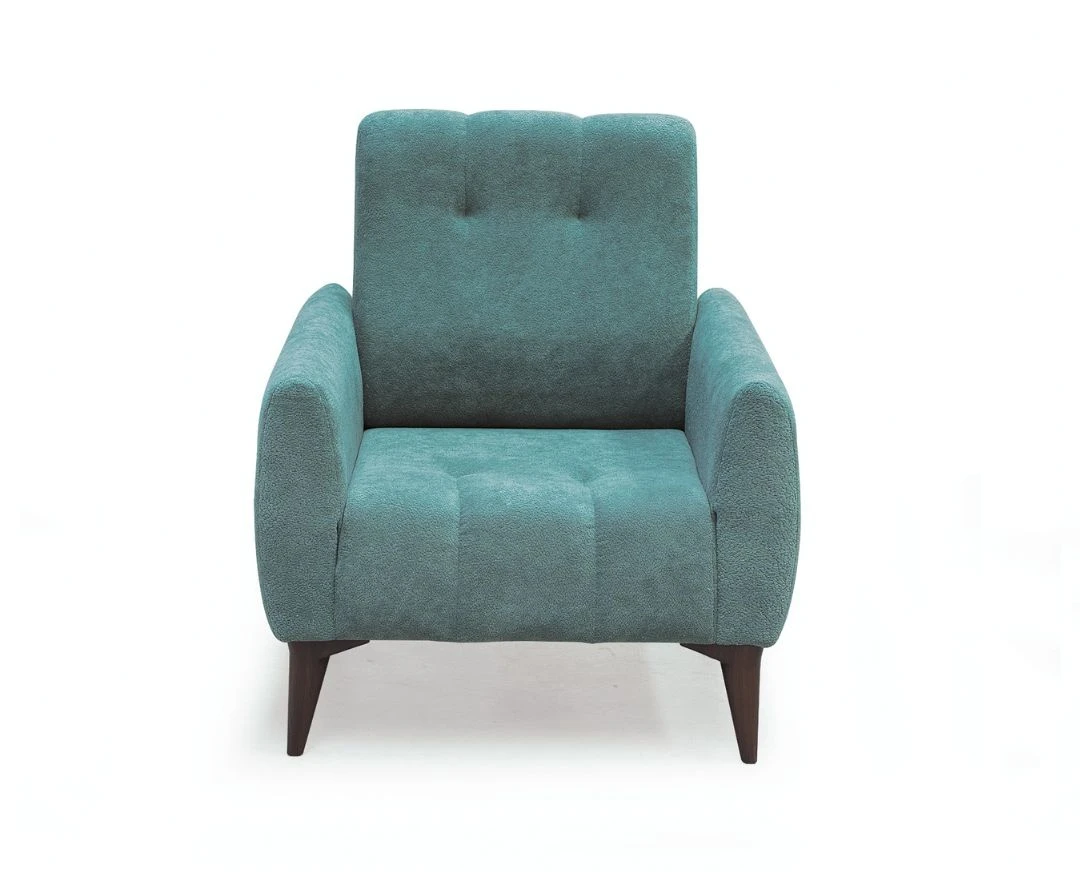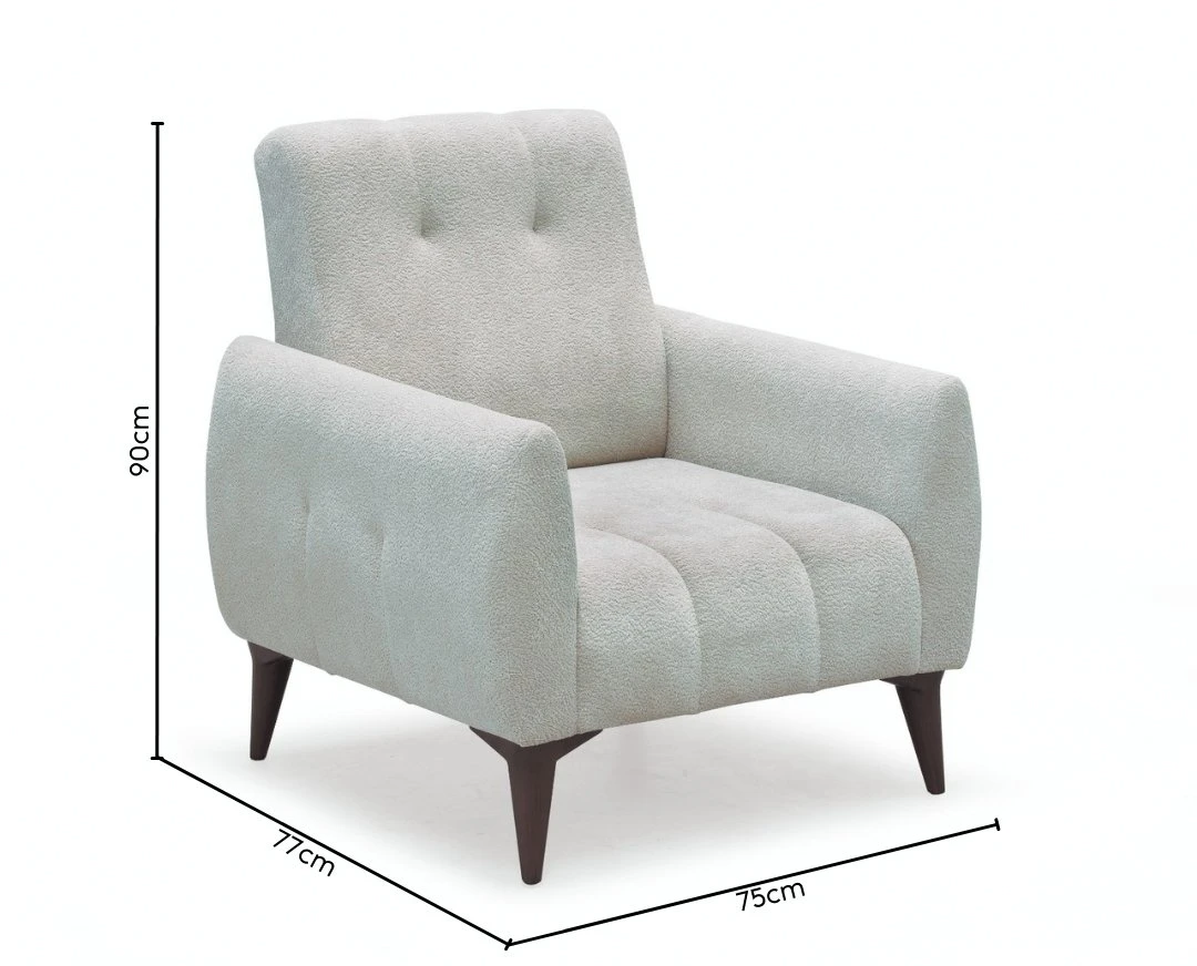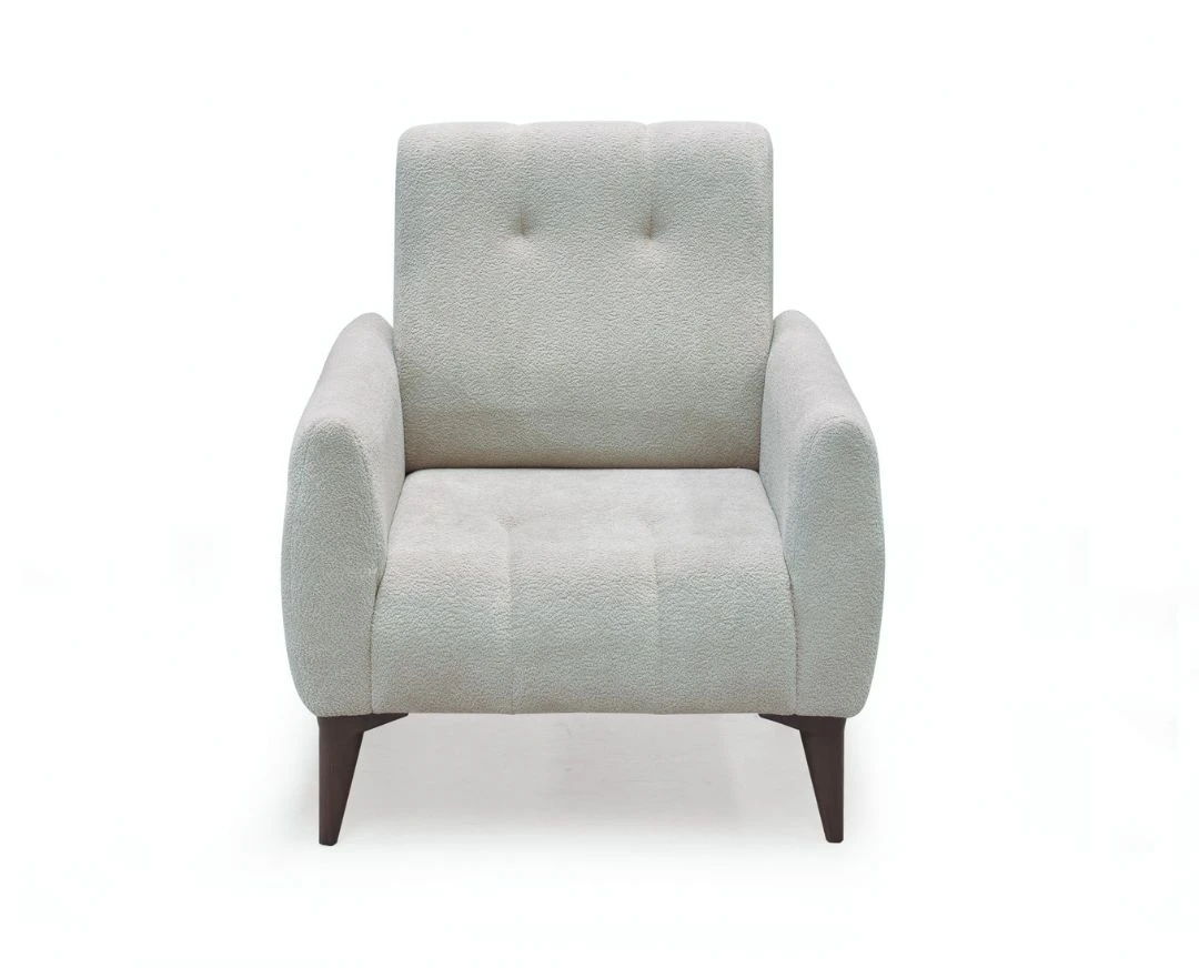 Fotelja Cocco je kompaktan, ali izrazito udoban komad nameštaja koji se savršeno uklapa uz istoimeni trosed ili funkcioniše samostalno kao akcenat u prostoru. Tapacirana u nežni bukle materijal, dostupna u bež i mint zelenoj boji, ova fotelja kombinuje toplu teksturu sa savremenim linijama.