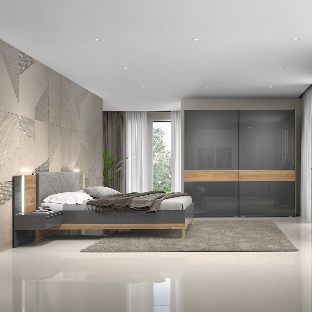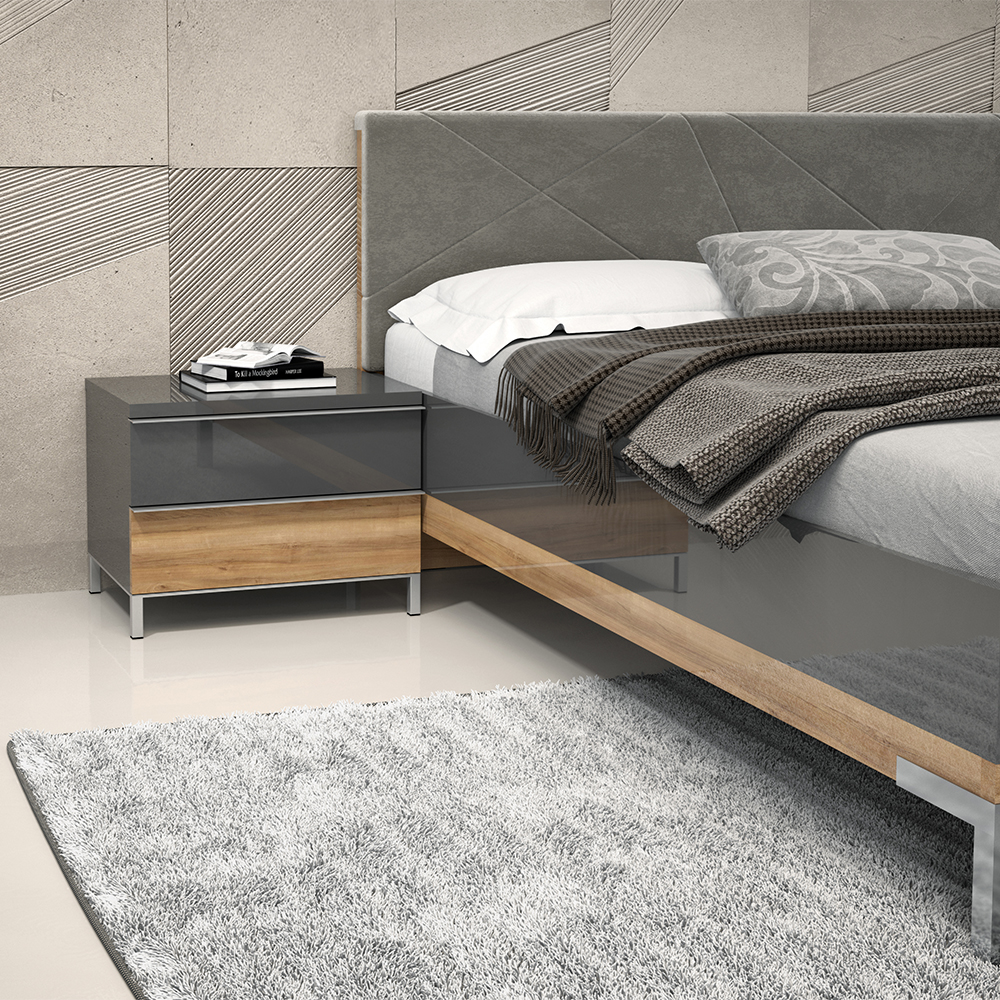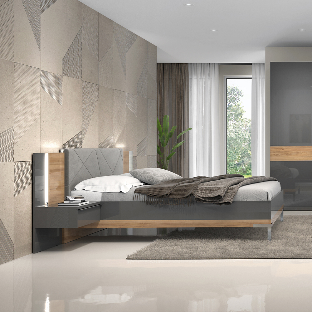 - konstrukcija kreveta lakirana UV lakom u visokom sjaju, u artaktivnoj Antracit boji i sa aplikacijom u dekoru Pacifik orah;
