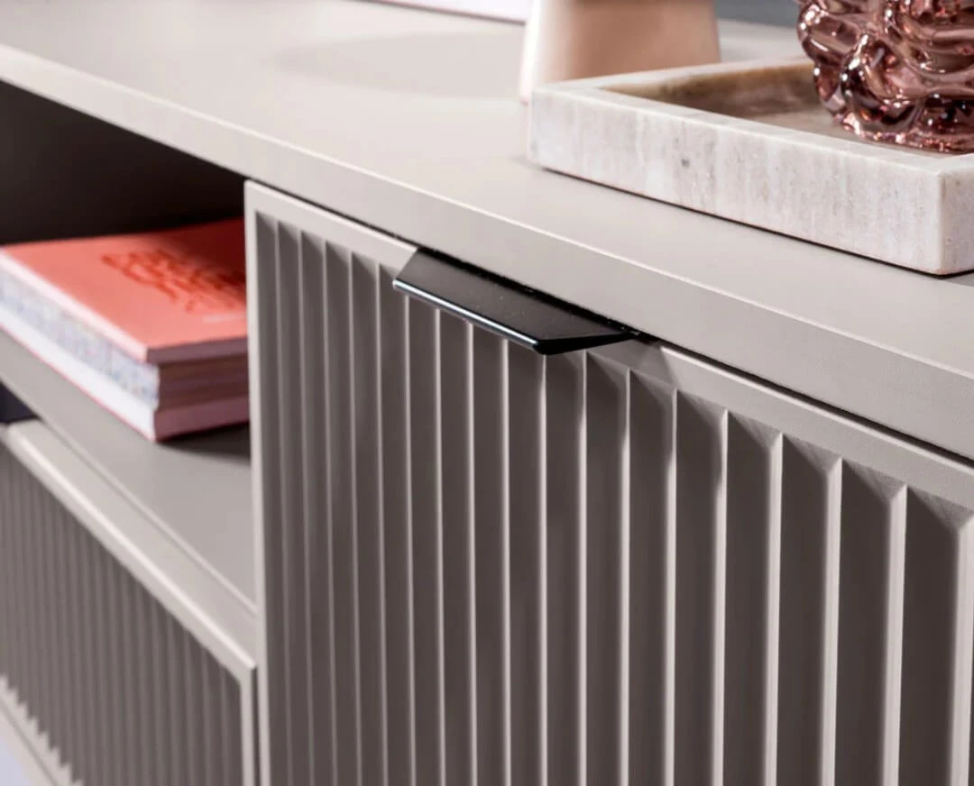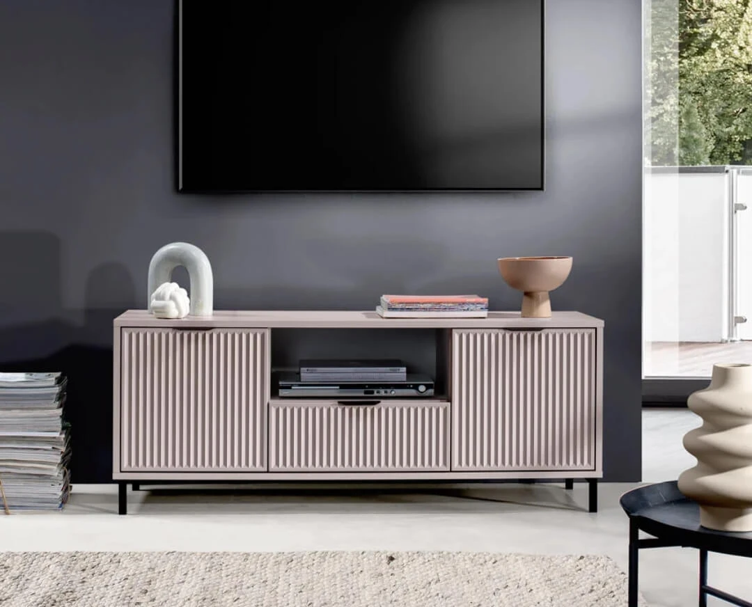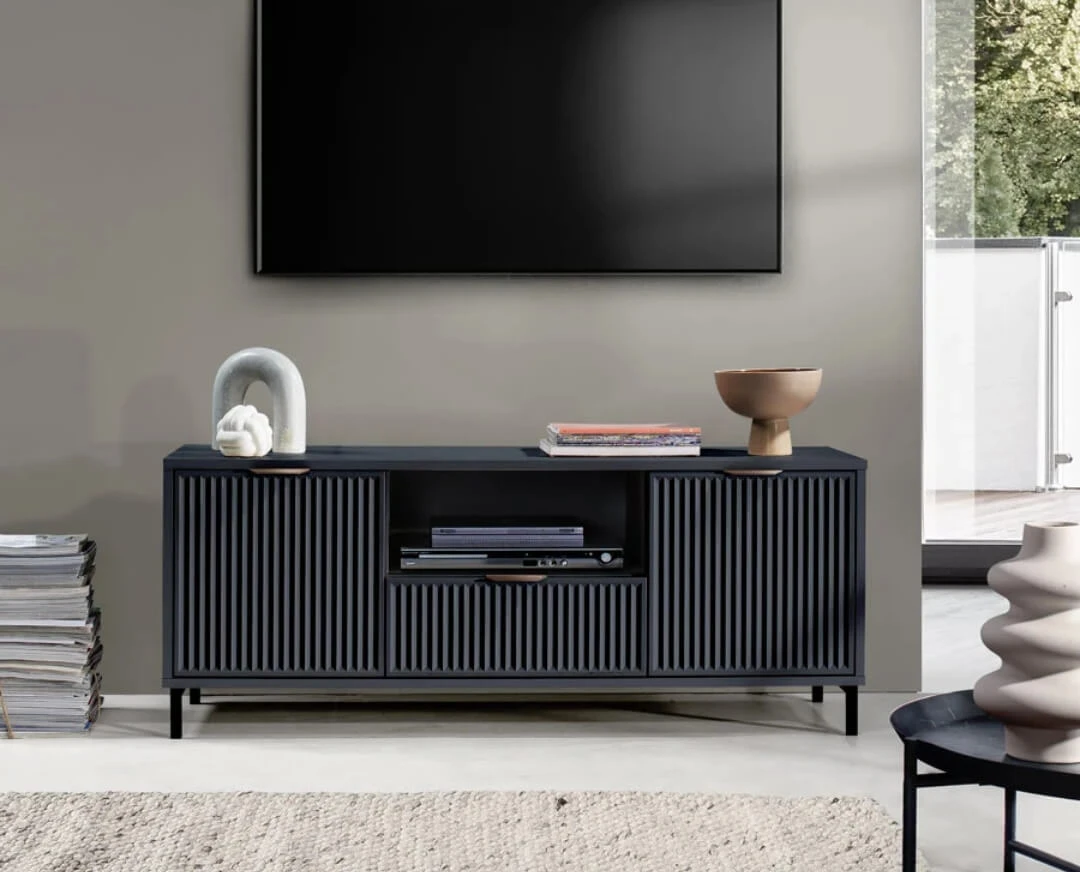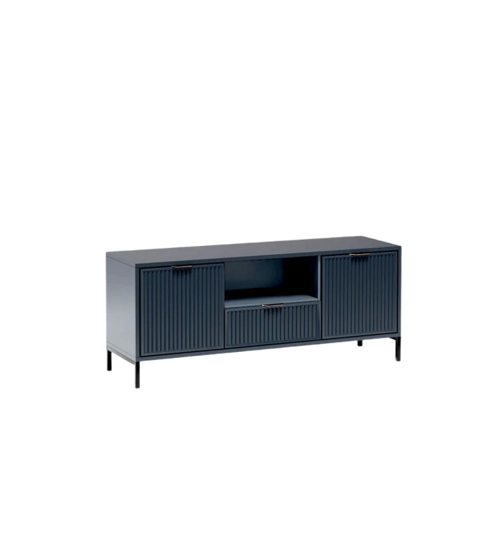 Moderan TV ormarić sa dizajnerskom završnom obradom. Srednji deo je praktična polica za set-top bok ili drugu RTV opremu, ispod prostrane fioke za razne sitnice. Sa strane, dva ormarića za dodatne stvari. Ormar u kombinaciji sa drugim nameštajem u dnevnoj sobi stvoriće prelep enterijer. Dostupan u dve boje – kašmir/indigo.
