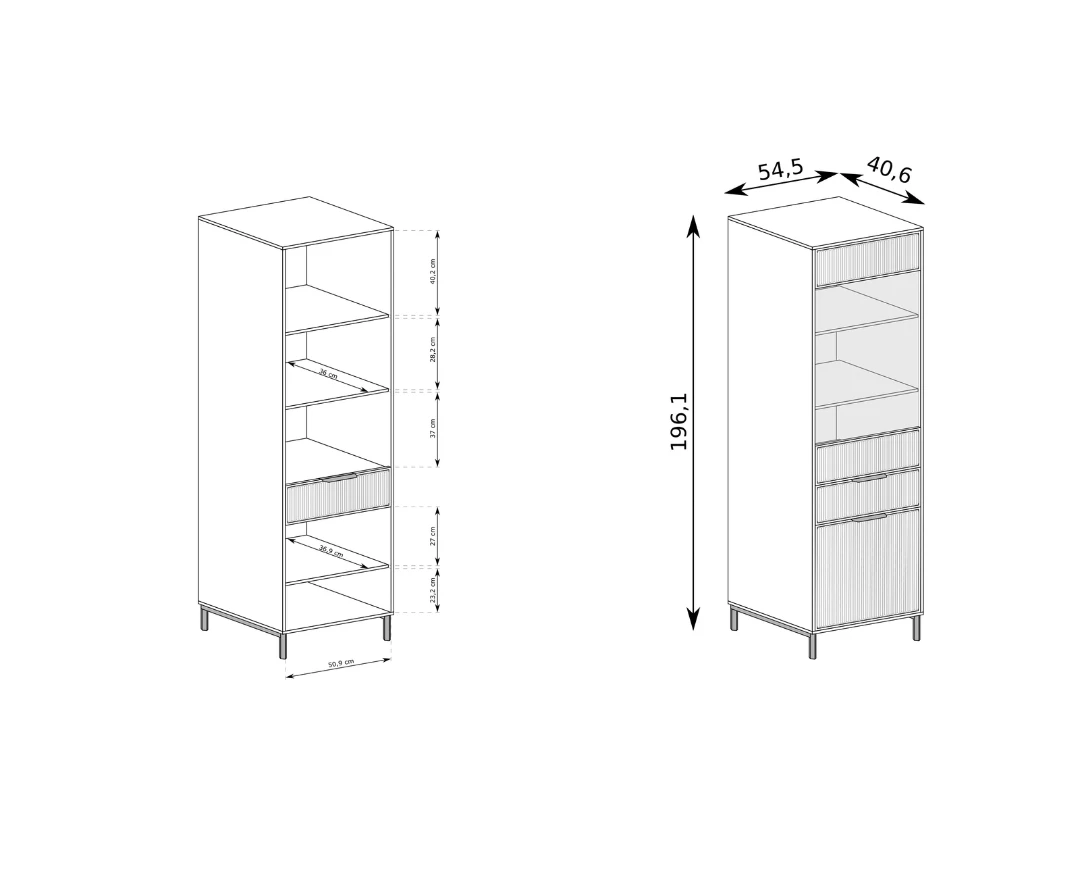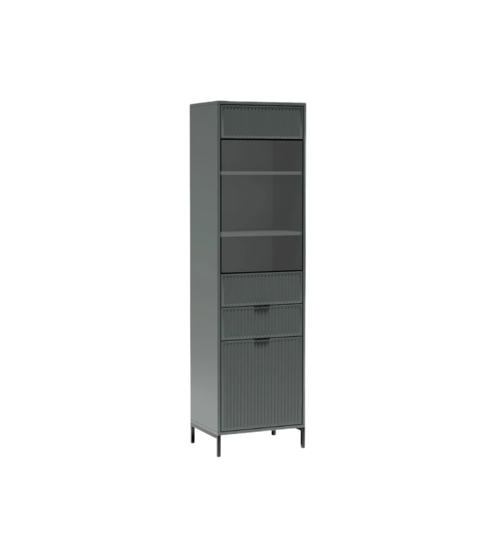 Prelepa vitrina koja će svojom dizajnerskom završnom obradom ukrasiti svaki dnevni boravak. U donjem delu ćete naći ormarić sa policom i prostranom fiokom iznad njega. Gornji deo je staklena vitrina sa dve police. Sajt je opremljen sistemom push to open. Dostupan u dve boje – kašmir/indigo.