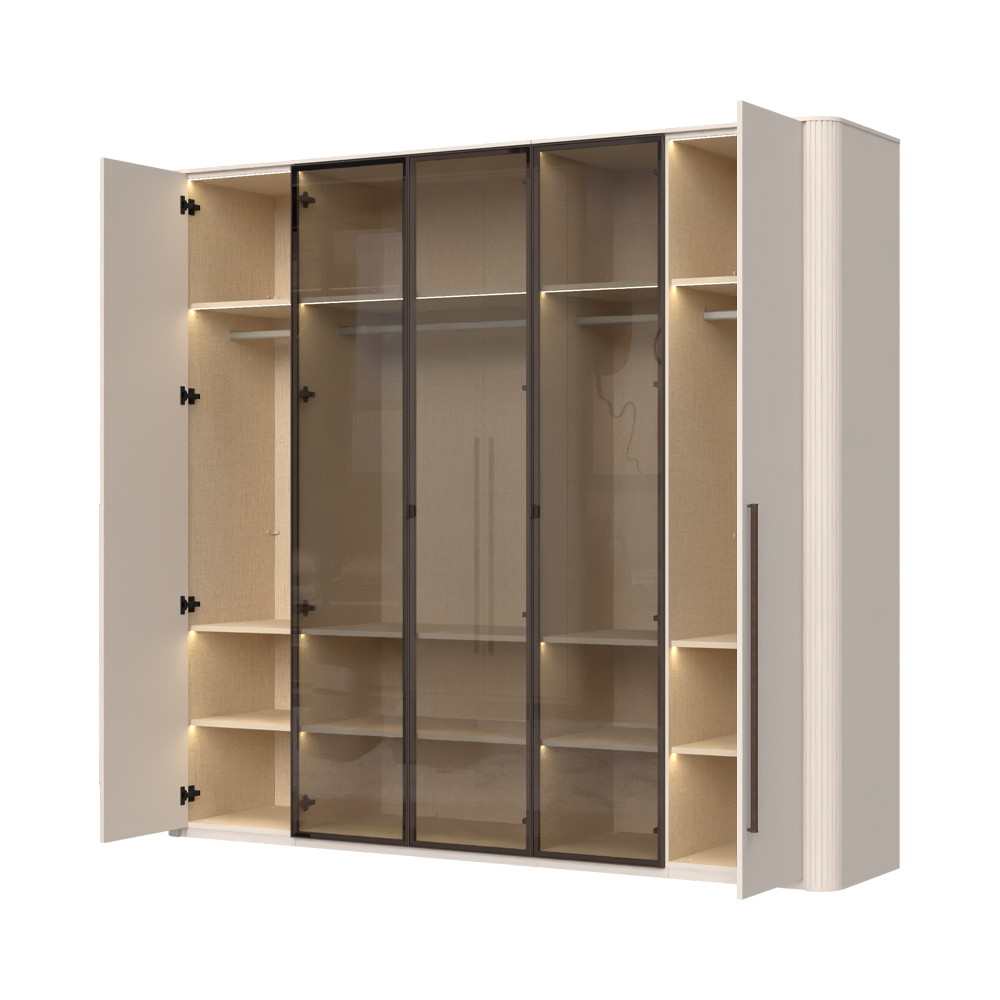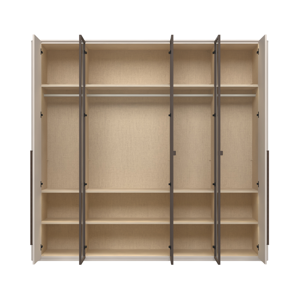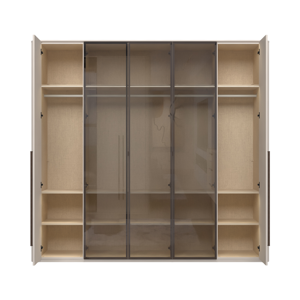 Funkcionalni plakar sa 3 krila lakirana UV soft mat lakom u dekoru Kašmir i 2 staklena fronta sa aluminijumskim ramom u dekoru Midnight Copper.
