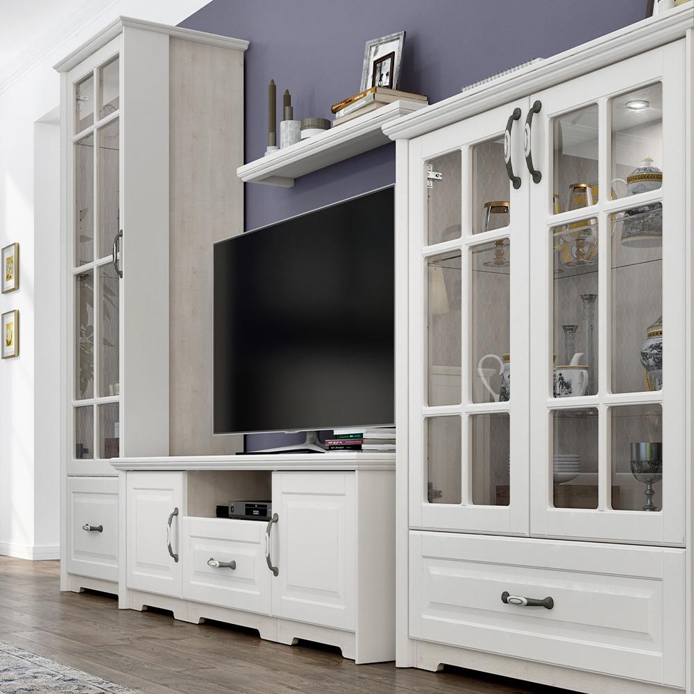 - frontovi, dekorativne lajsne i pokrivna ploča TV stola su od medijapana kompletno lakiranog UV lakom sa soft mat efektom u boji Slonova kost